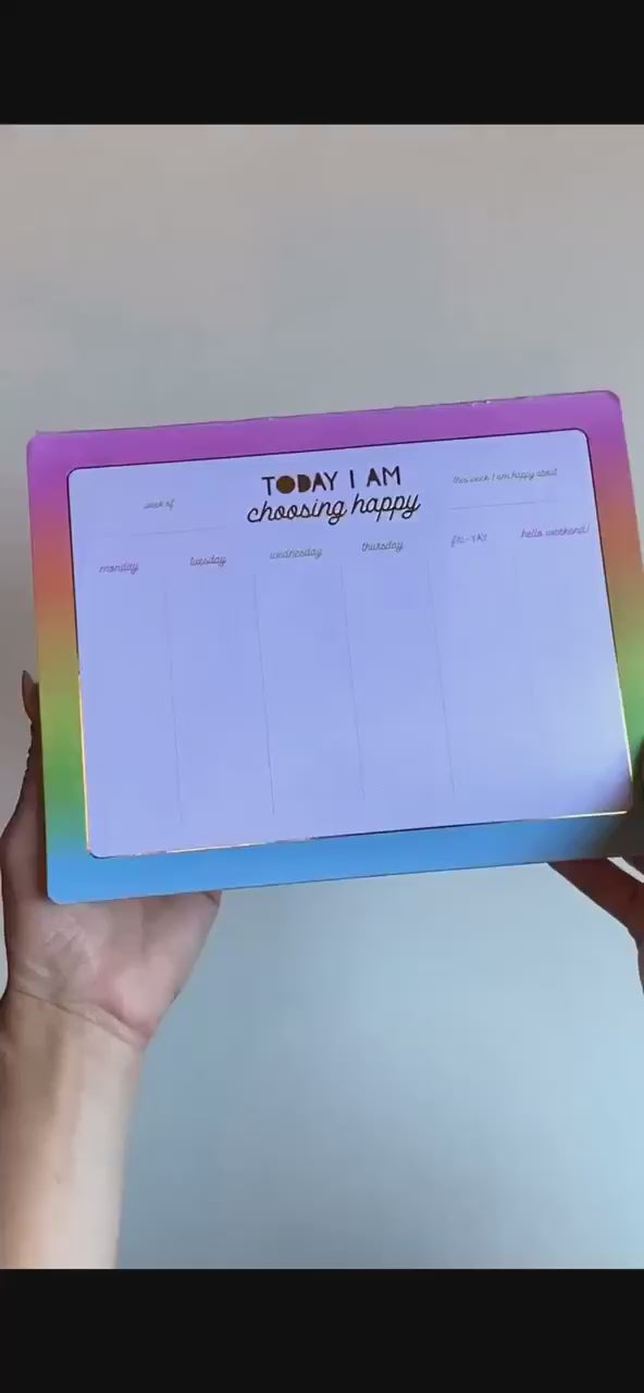 Our favorite weekly planner comes in a fun design! The ombre colors. The choose happy reminder! It's the perfect addition to your desk. Some of our favorite details include the words "FRIYAY" and "hello weekend" imprinted on the planner.