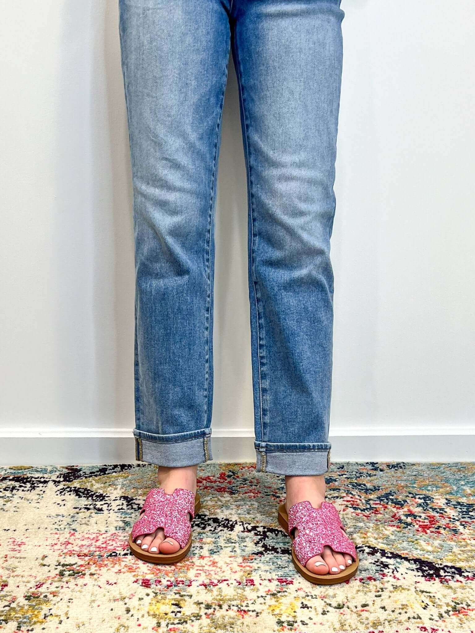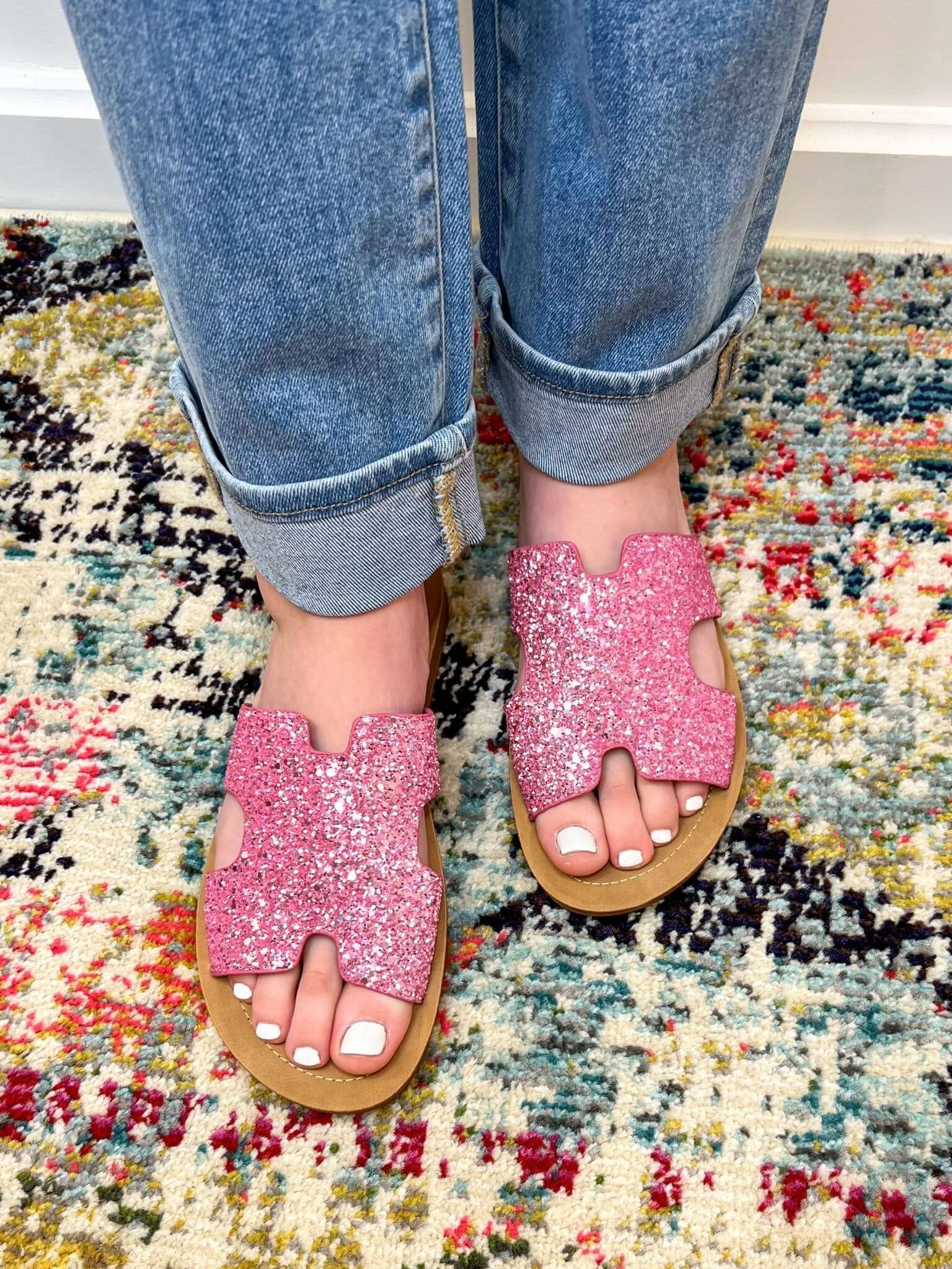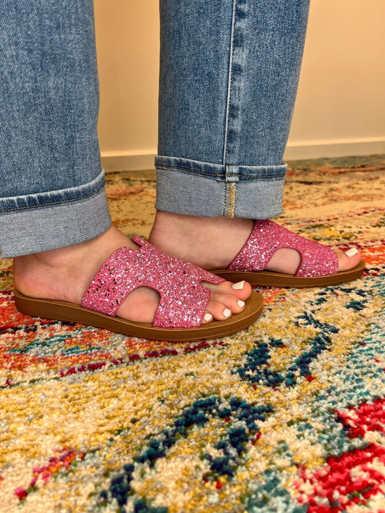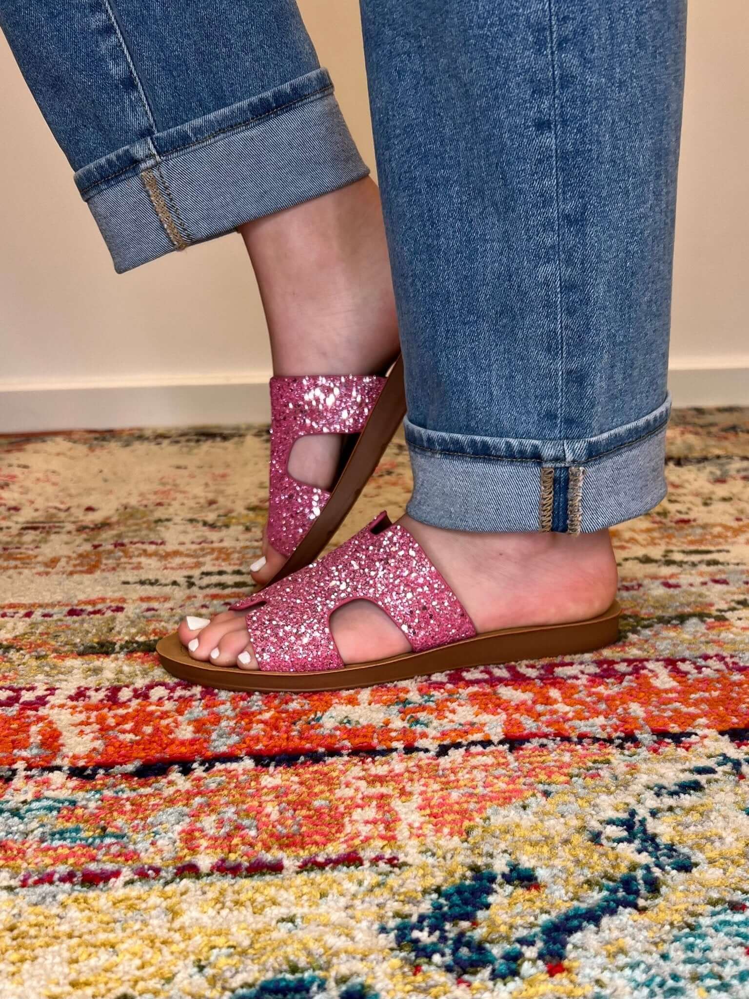 Elevate your summer style with Bogalusa, the perfect sandal for any occasion. Its sleek pink chunky glitter details add a touch of sparkle to any outfit. Whether paired with a dress, jeans, or shorts, these ultra-comfy sandals will keep you looking and feeling your best all day long.