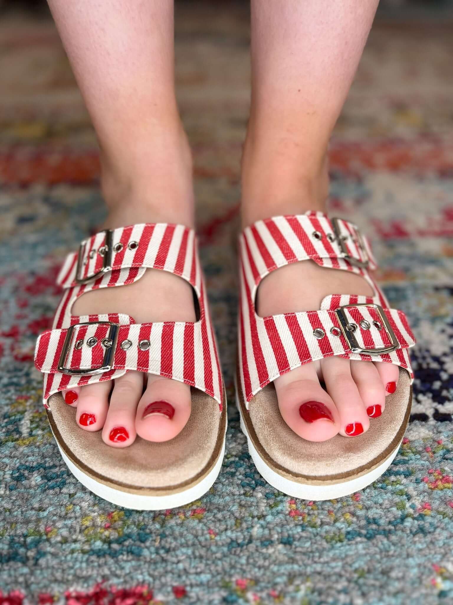 Introducing the Corkys Dash Sandal in an eye catching red and natural stripe! These shoes will your new go-to for effortless style! With a double-strap design and adjustable buckles, you'll get the perfect fit every time. The cushioned insole provides all-day comfort while the 1/2" platform adds a little lift. Whether running errands or going out, these vibrant sandals are sure to turn heads. Say hello to your new favorite pair!