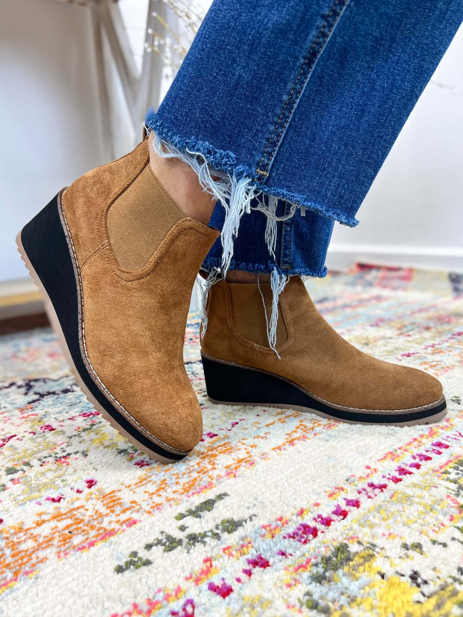 Step up your shoe game with Love You A Latte Wedge Shoe Booties. Featuring a 2.5" heel and Corkys soft insoles, you'll be comfortable all day long. These tobacco colored booties are both stylish and easy to slip on and off.