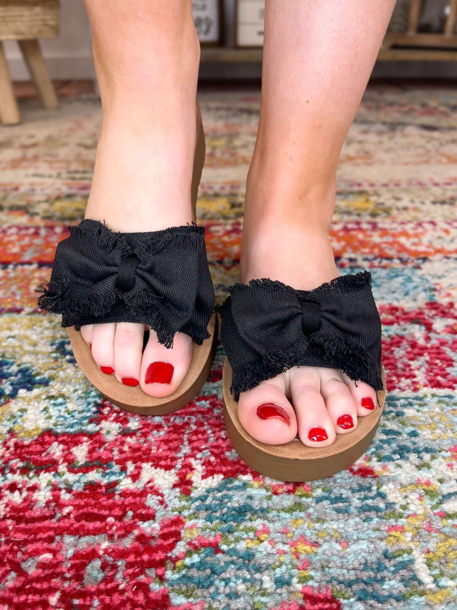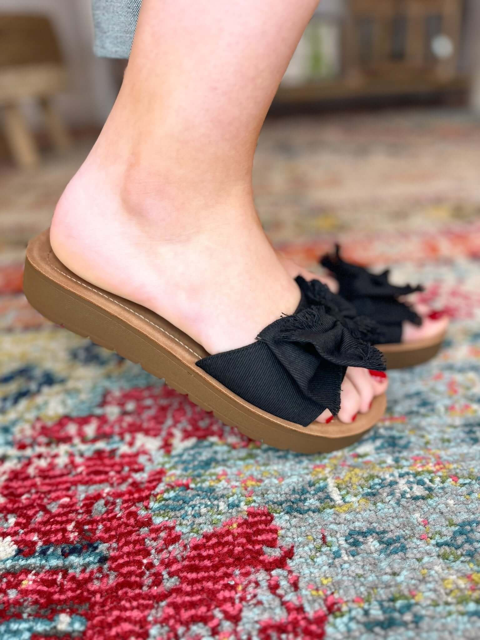 Elevate your summer look with our Bow Slide Sandals. The knotted strap with a canvas black double bow adds a playful touch to any outfit. Enjoy all-day comfort and support with the cushioned footbed and lightweight sole. The textured outsole provides extra grip for beach days or casual outings.