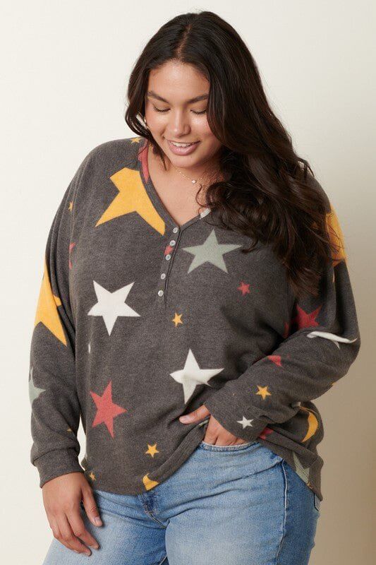 The Cosmic Star Brushed Top features a stylish star print on a soft, brushed knit fabric. The charcoal colored V-neck and button detail on the front add a touch of elegance, while the raglan long sleeves with cuff band finish offer a comfortable and flattering fit. Complete your look with this versatile top that boasts a straight hemline.