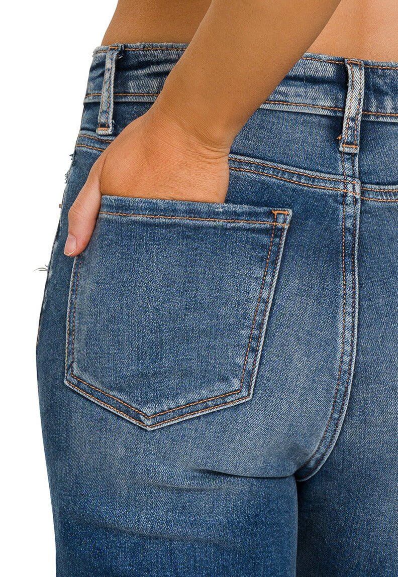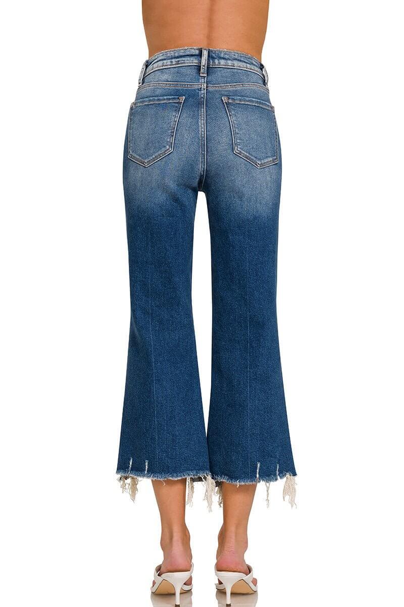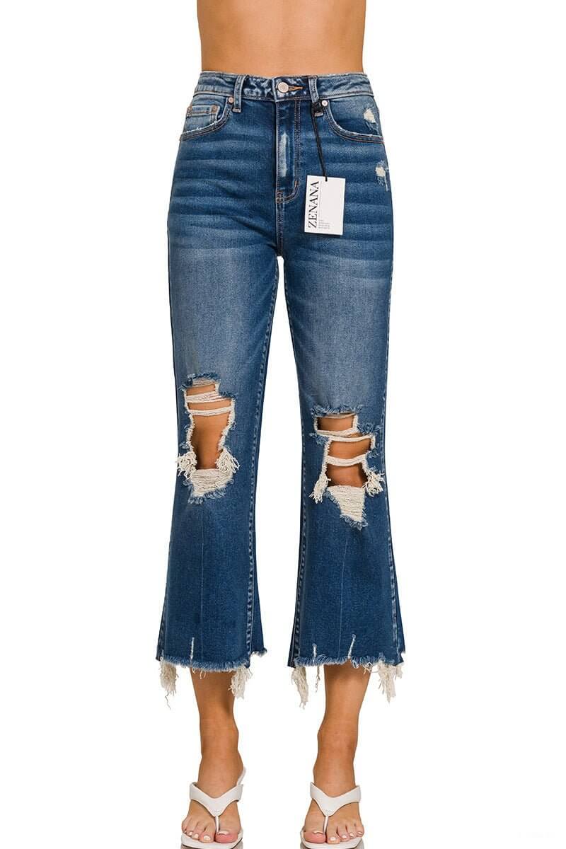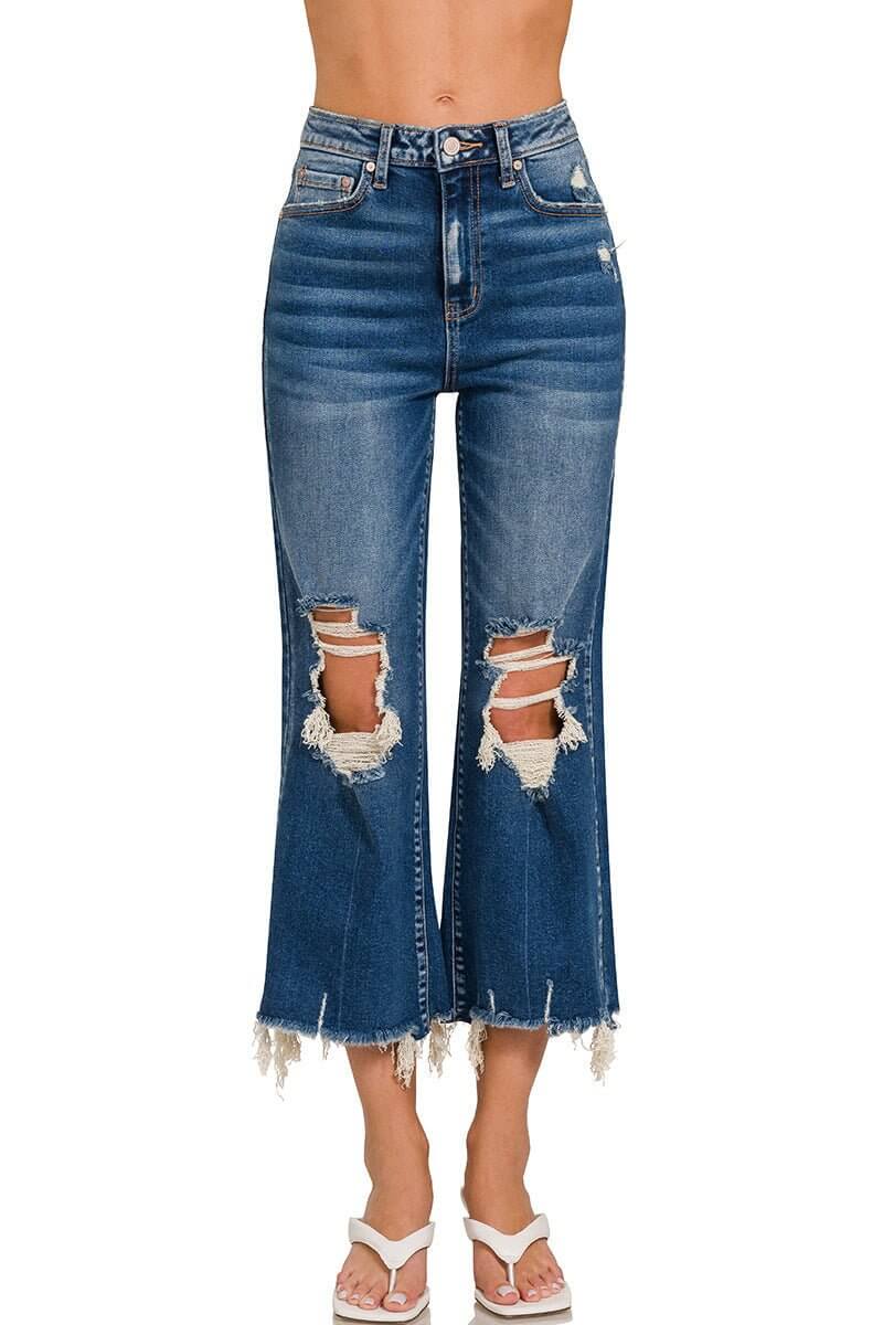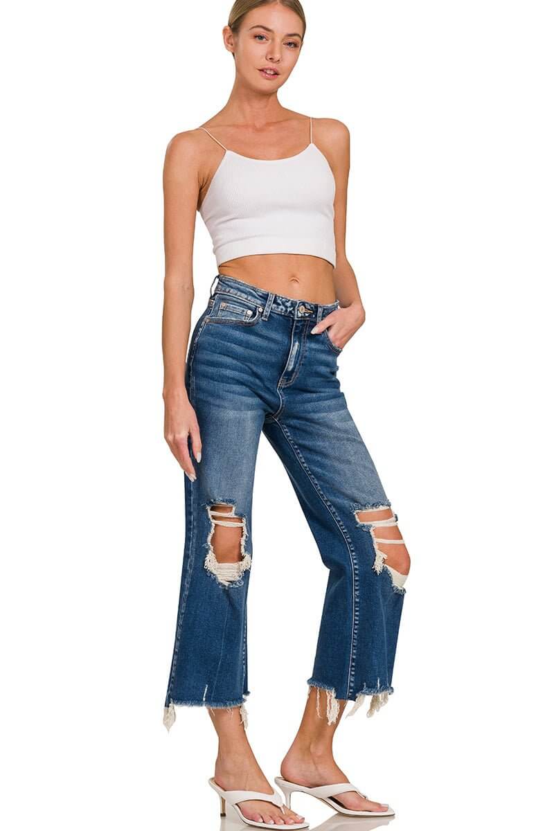 Rock your style with Geena Straight Distressed Raw Hem Cropped Jeans. These denim pants feature a high-waist for a slim and flattering look. The distressed knee and raw frayed hems add an edgy touch, while the slightly flared leg opening brings a fun and playful vibe.
