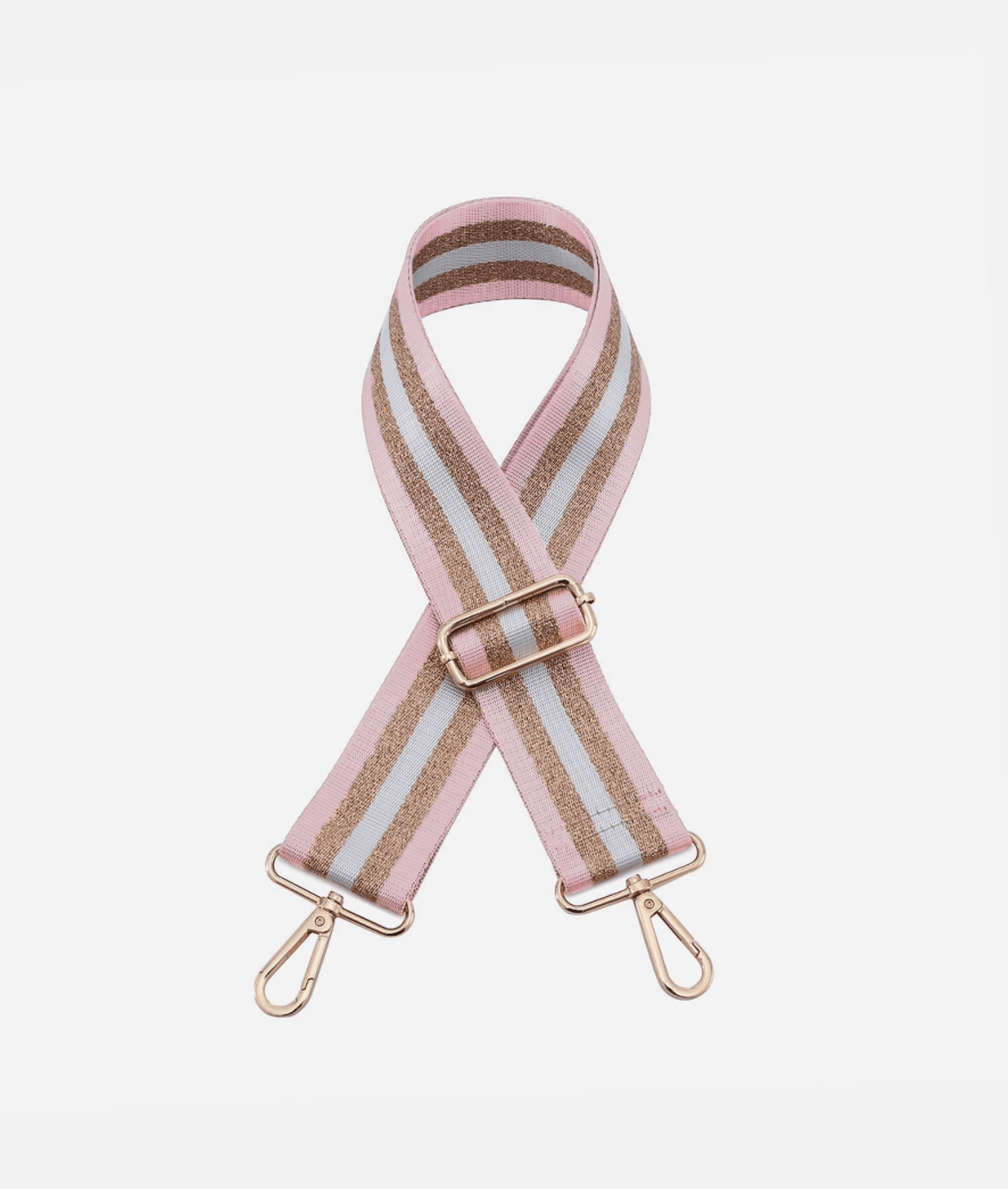 Elevate your handbag game with the Striped Pink/Gold Guitar Purse Strap. This beautiful strap adds a touch of versatility and style. Use the adjustable design and gold-tone hardware to complement any outfit. Plus, with secure metal clasps at both ends, you can carry your bag with confidence wherever you go.